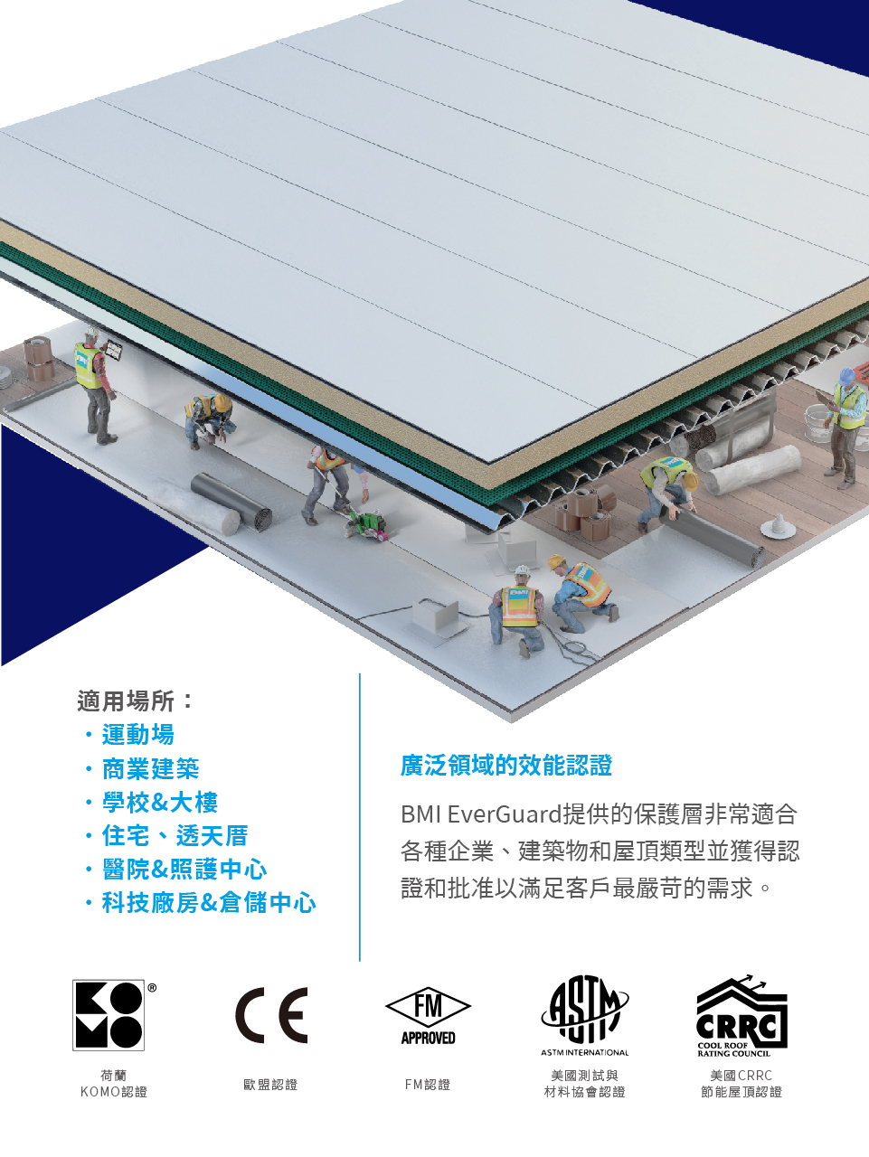 我們稱之為EVERGUARD是原因我們提供最耐用、堅固和高耐久性的屋頂防水捲材。其目的在保護您的投資、資產和人員。